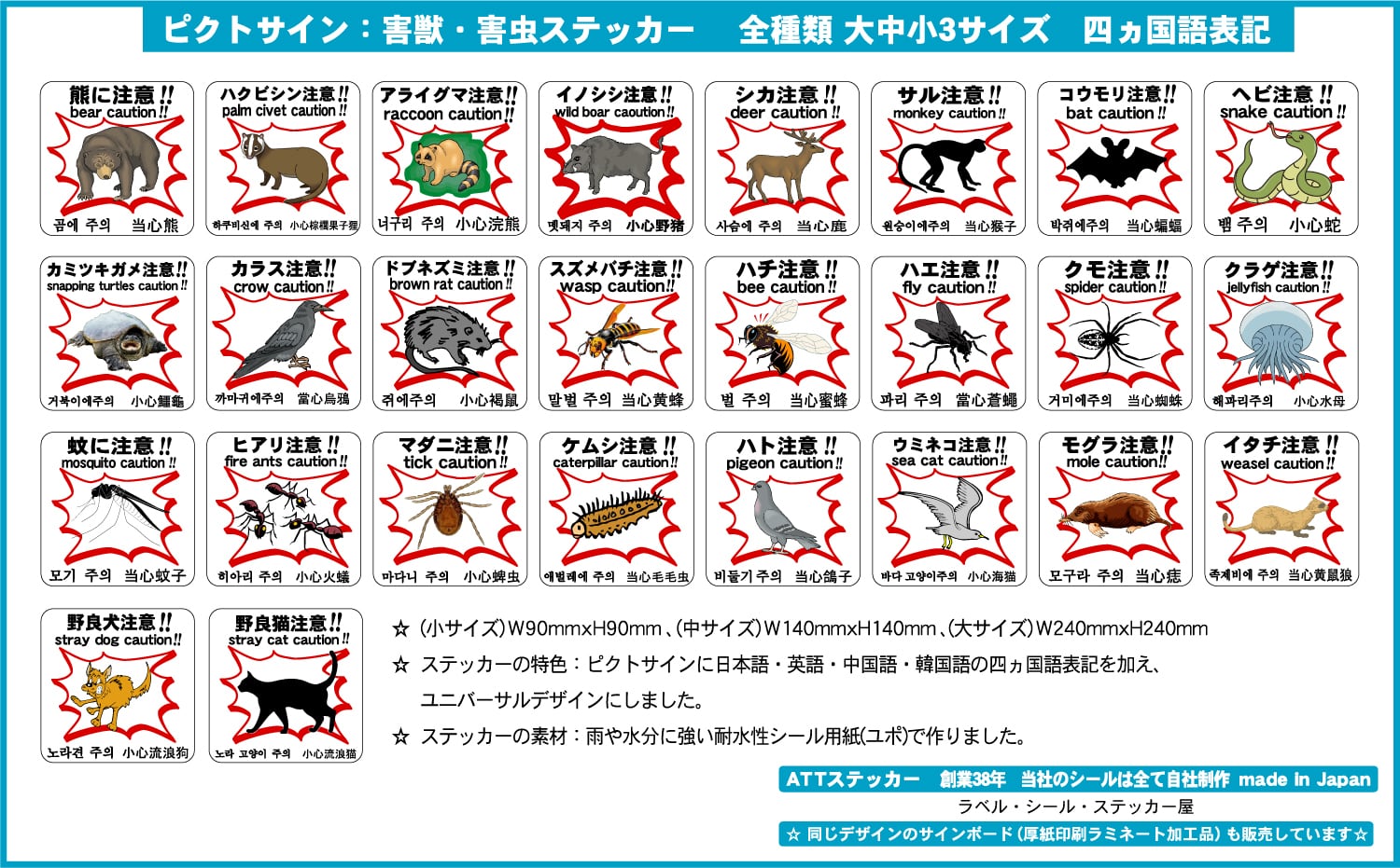 ステッカータイプ、ボードタイプ(防水 ラミネート加工)の2種類に、サイズは大、中、小の3種類がございます。