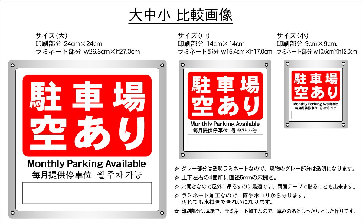 ステッカータイプ、ボードタイプ(防水 ラミネート加工)の2種類に、サイズは大、中、小の3種類がございます。
