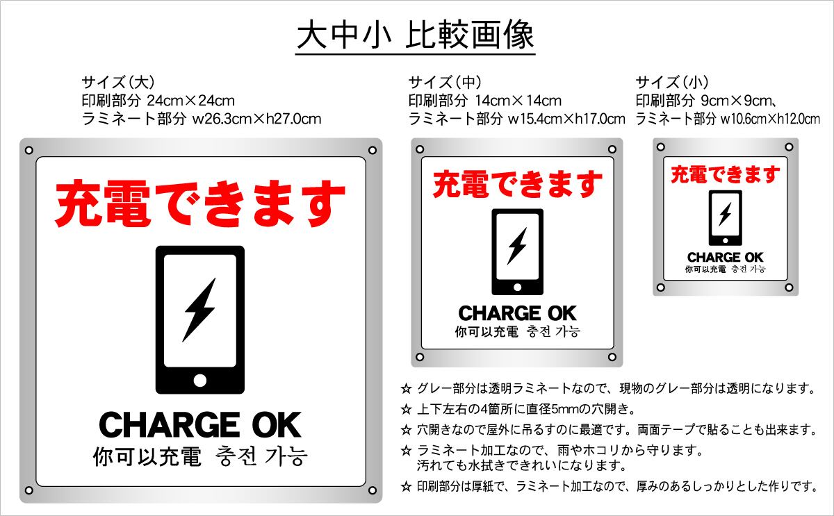 ステッカータイプ、ボードタイプ(防水 ラミネート加工)の2種類に、サイズは大、中、小の3種類がございます。