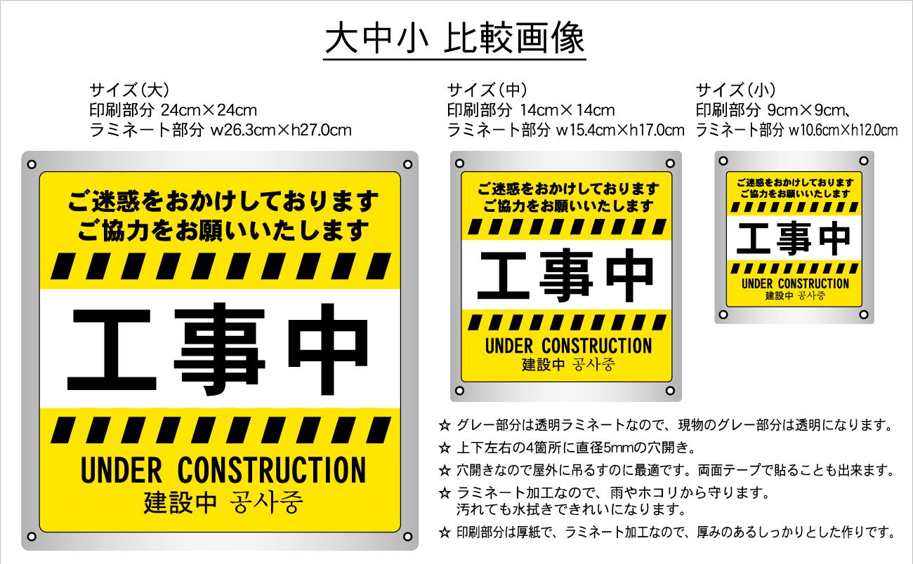 ステッカータイプ、ボードタイプ(防水 ラミネート加工)の2種類に、サイズは大、中、小の3種類がございます。