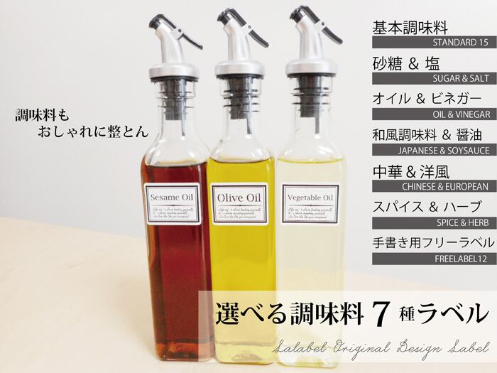 ラベル内容:砂糖/塩/しょうゆ/オリーブオイル/植物油/ゴマ油/酢/みりん/料理酒/こしょう/マヨネーズ/ケチャップ/ウスターソース/ドレッシング/味噌
