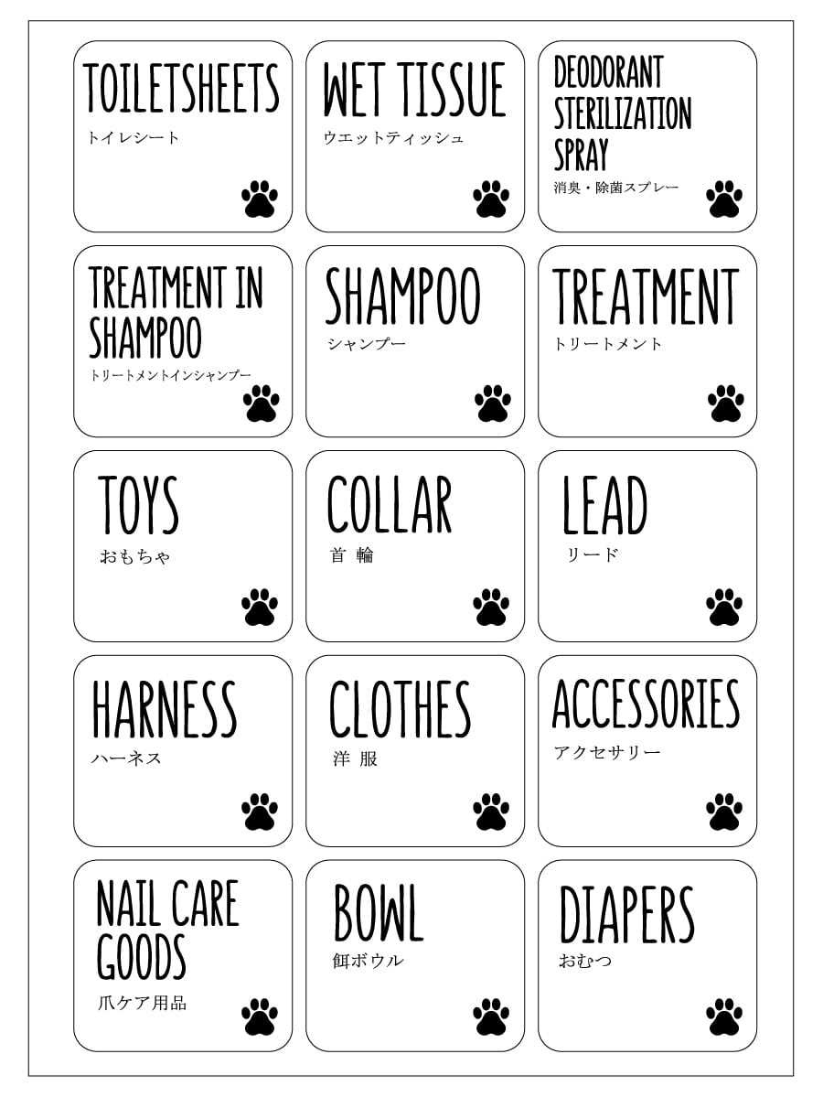 TOILETSHEETS/WETTISSUE/DEODORANTSTERILIZATIONSPRAY/TREATMENTINSHAMPOO/SHAMPOO/TREATMENT/TOYS/COLLAR/LEAD/HARNESS/CLOTHES/ACCESSORIES/NAILCAREGOODS/BOWL/DIAPERS/PLASTICBAGS/DEODORIZEBAGS/ROLLCLEANER/TOOTHCAREGOODS/SUPPLEMENTS/MEDICINE/GROOMINGGOODS/AMENITYGOODS/DOCUMENTS/×各1枚 /手書き用×6枚