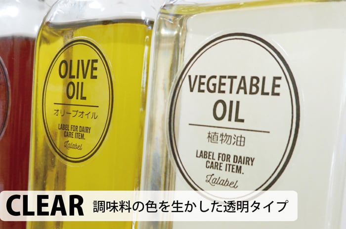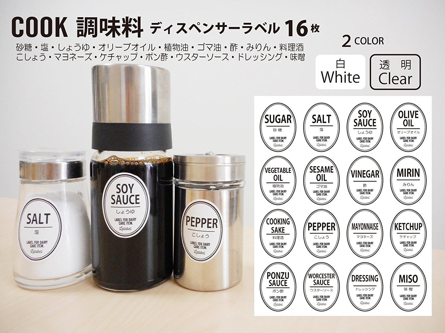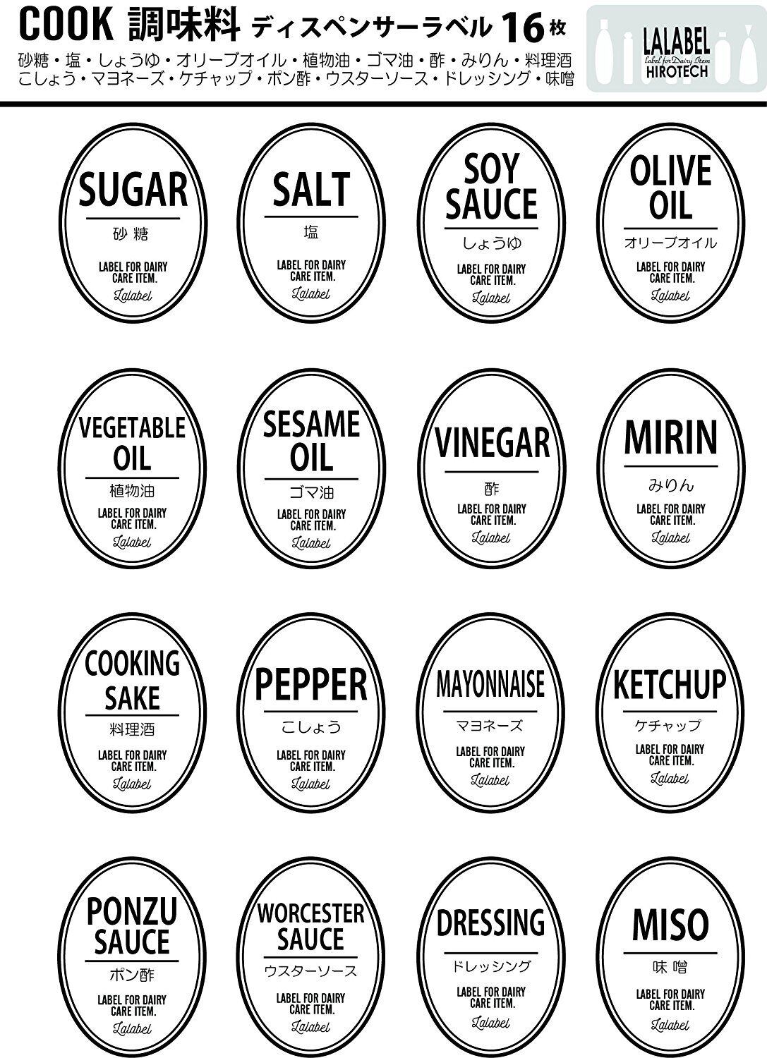 ラベル内容:砂糖/塩/しょうゆ/オリーブオイル/植物油/ゴマ油/酢/みりん/料理酒/こしょう/マヨネーズ/ケチャップ/ポン酢/ウスターソース/ドレッシング/味噌
