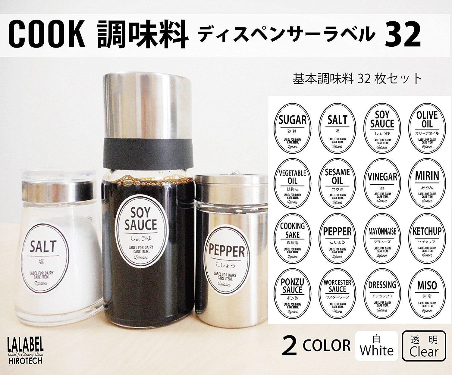 ラベル内容:砂糖/塩/しょうゆ/オリーブオイル/植物油/ゴマ油/酢/みりん/料理酒/こしょう/マヨネーズ/ケチャップ/ポン酢/ウスターソース/ドレッシング/味噌/めんつゆ/すし酢/旨味調味料/和風だし/コンソメ/鶏ガラスープの素/ブイヨン/オイスターソース/ラー油/七味/ハーブソルト/鷹の爪/ローレル/塩こしょう/フリーラベル×2枚