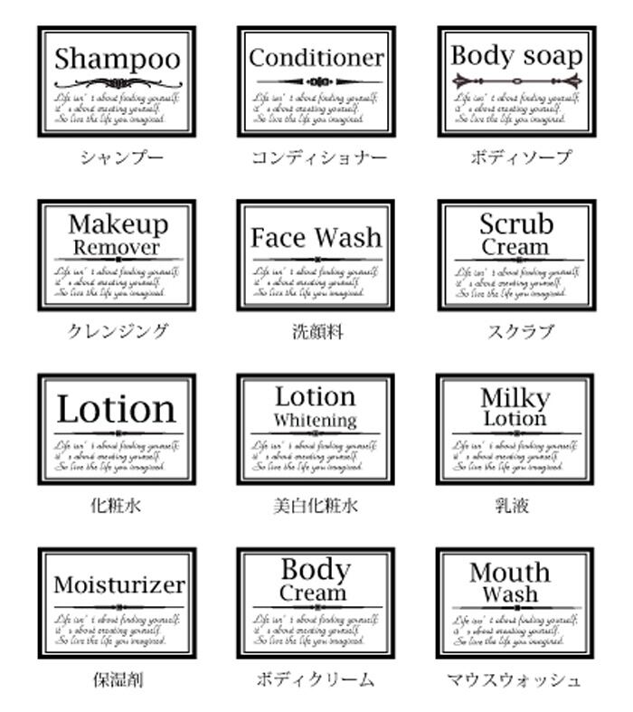 ラベル内容:シャンプー/コンディショナー/ボディソープ/クレンジング/洗顔料/スクラブ/化粧水/美白化粧水/乳液/保湿剤/ボディクリーム/マウスウォッシュ