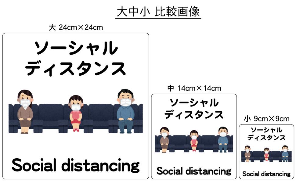 ステッカータイプ、ボードタイプ(防水 ラミネート加工)の2種類に、サイズは大、中、小の3種類がございます。