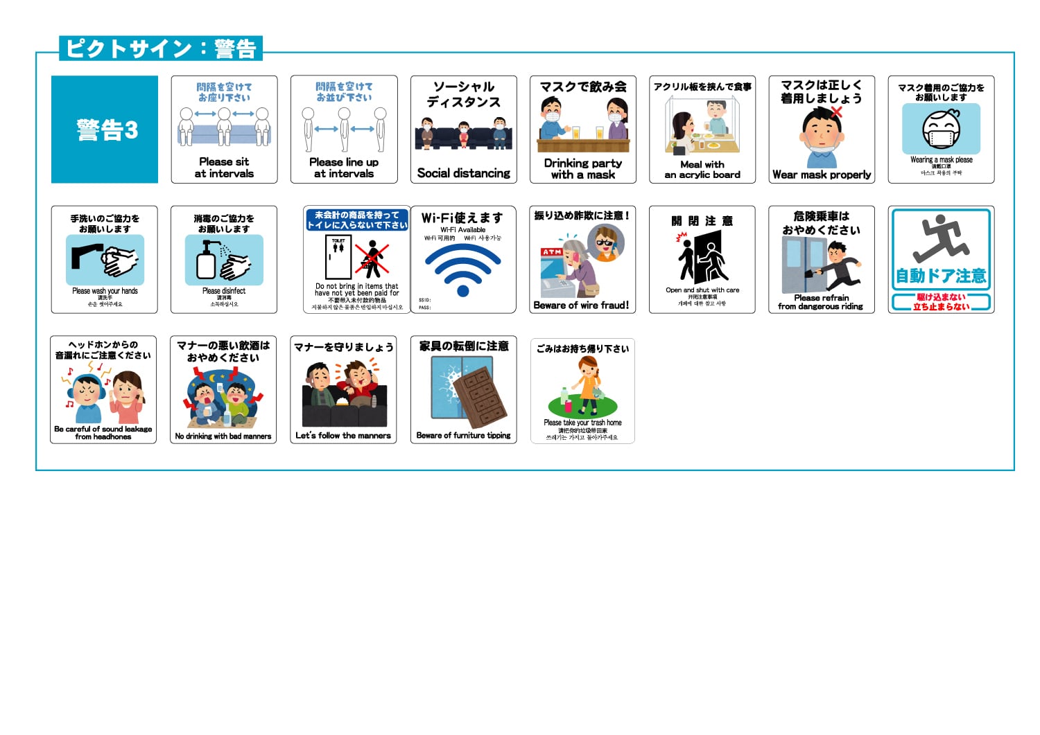 ピクトサインに日本語・英語・韓国語・中国語の4か国語表記のオリジナルデザイン商品です。