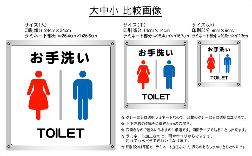 ステッカータイプ、ボードタイプ(防水 ラミネート加工)の2種類に、サイズは大、中、小の3種類がございます。
