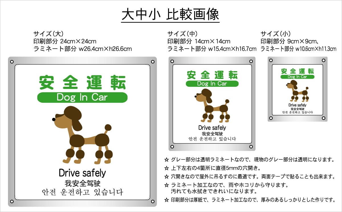 ステッカータイプ、ボードタイプ(防水 ラミネート加工)の2種類に、サイズは大、中、小の3種類がございます。
