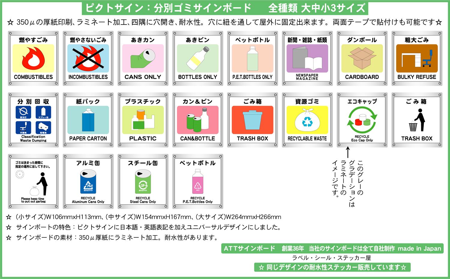 ステッカータイプ、ボードタイプ(防水 ラミネート加工)の2種類に、サイズは大、中、小の3種類がございます。