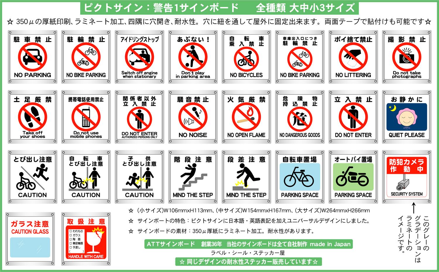 ステッカータイプ、ボードタイプ(防水 ラミネート加工)の2種類に、サイズは大、中、小の3種類がございます。