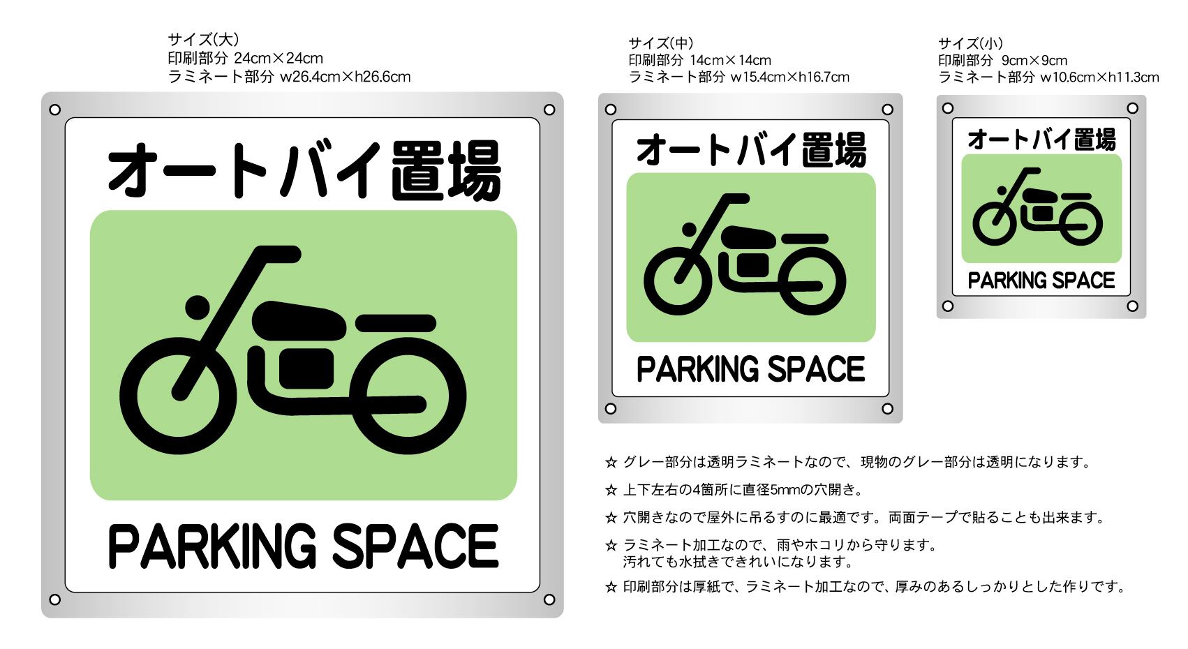 ステッカータイプ、ボードタイプ(防水 ラミネート加工)の2種類に、サイズは大、中、小の3種類がございます。