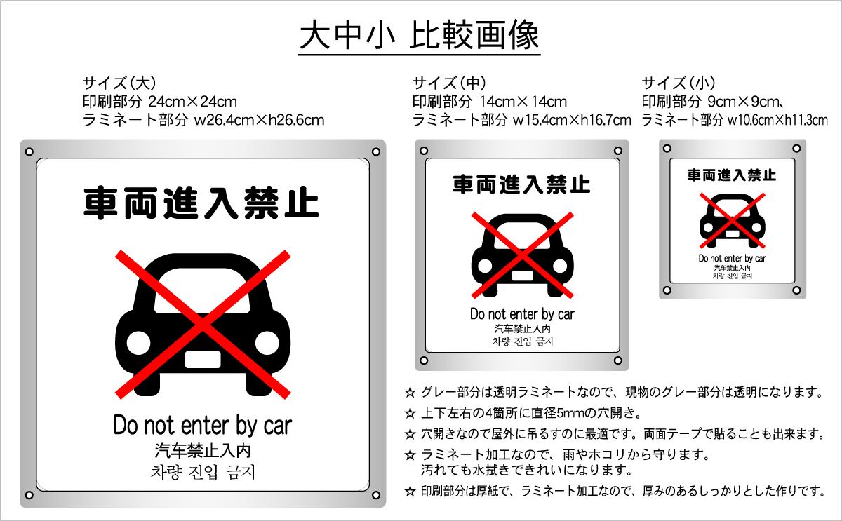 ステッカータイプ、ボードタイプ(防水 ラミネート加工)の2種類に、サイズは大、中、小の3種類がございます。