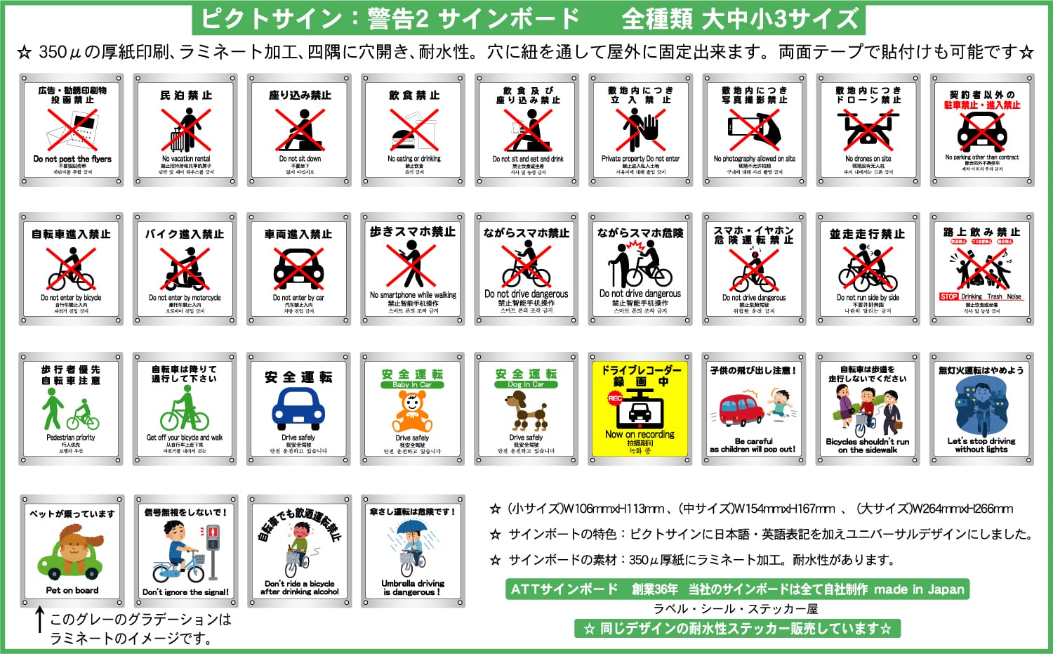 ステッカータイプ、ボードタイプ(防水 ラミネート加工)の2種類に、サイズは大、中、小の3種類がございます。