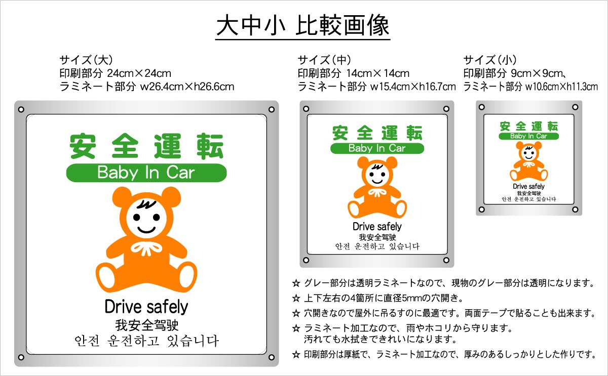 ステッカータイプ、ボードタイプ(防水 ラミネート加工)の2種類に、サイズは大、中、小の3種類がございます。