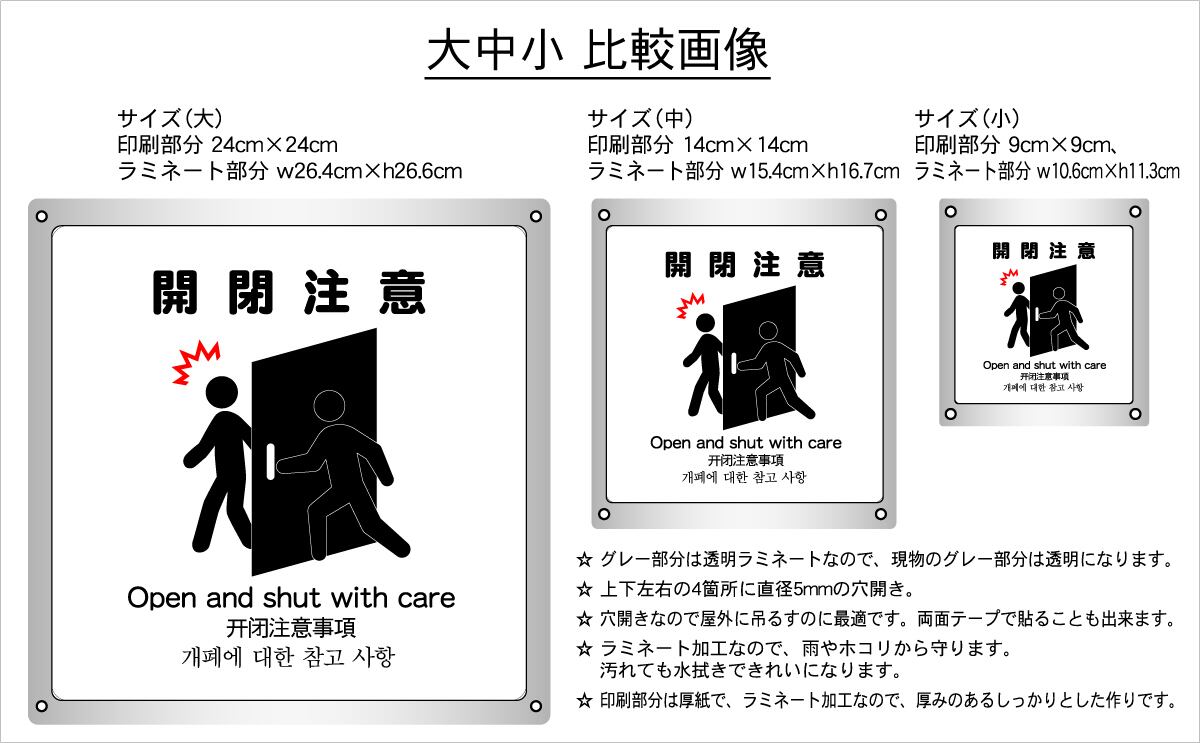 ステッカータイプ、ボードタイプ(防水 ラミネート加工)の2種類に、サイズは大、中、小の3種類がございます。